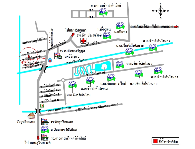 ถนนนิมิตใหม่ จากถนนสุวินทวงศ์มุ่งหน้าถนนลำลูกกา ผ่านโรงเรียนสารสาสน์วิเทศนิมิตใหม่ โรงเรียนวัดสุทธิสะอาด วัดสุทธิสะอาด ข้ามคลองสามตะวันออก ข้ามคลองสี่ตะวันออก จากนั้น เลี้ยวซ้ายเข้าซอยนิมิตใหม่ 55 อีกประมาณ 520 ม. จะพบทรัพย์สินอยู่ด้านขวามือ
