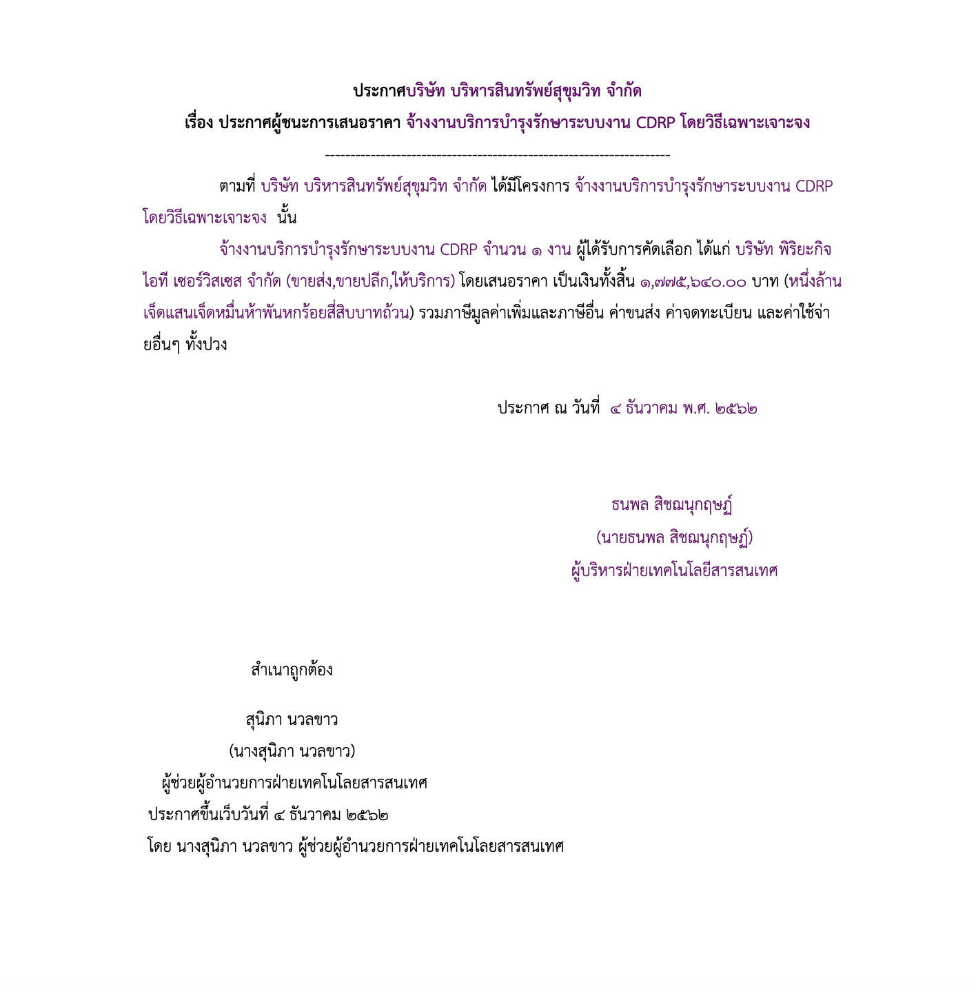 ประกาศรายชื่อผู้ชนะการเสนอราคา/ประกาศผู้ได้รับการคัดเลือก / ประกาศผู้ชนะการเสนอราคา จ้างงานบริการบำรุงรักษาระบบงาน CDRP โดยวิธีเฉพาะเจาะจง
