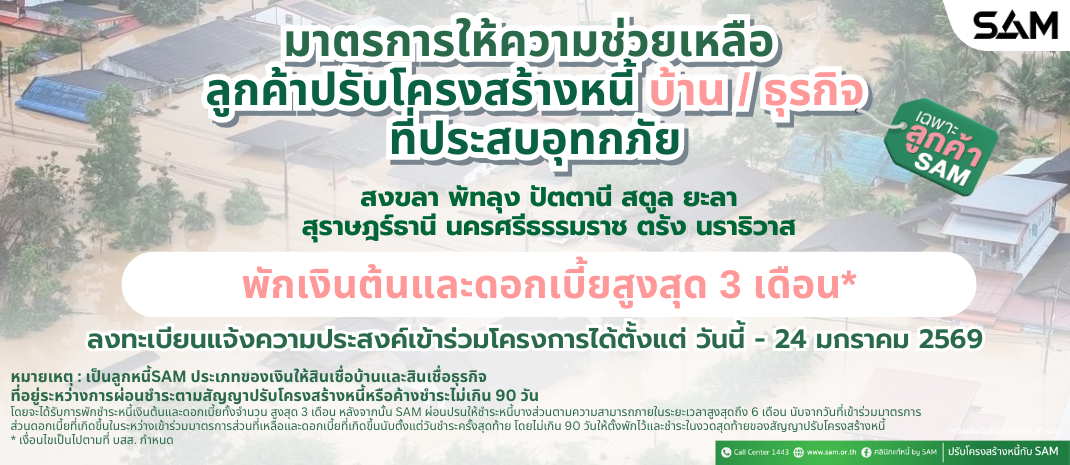 คุณสมบัติผู้เข้าร่วมโครงการ : เป็นลูกหนี้SAM ที่อยู่ระหว่างการผ่อนชาระตามสัญญาปรับโครงสร้างหนี้หรือค้างชาระไม่เกิน 90 วัน