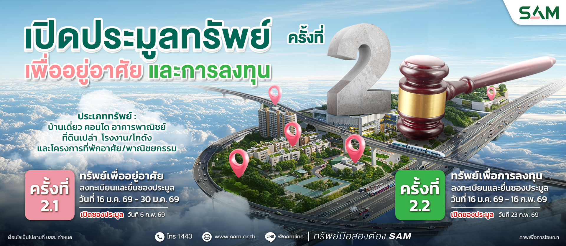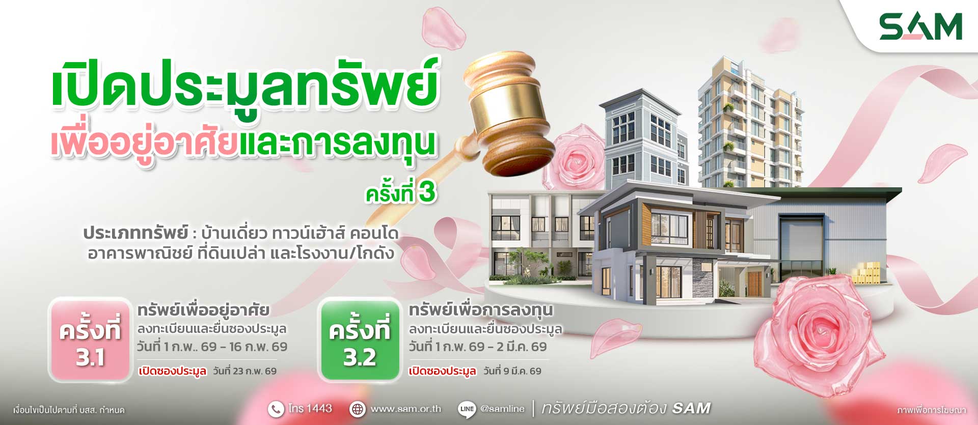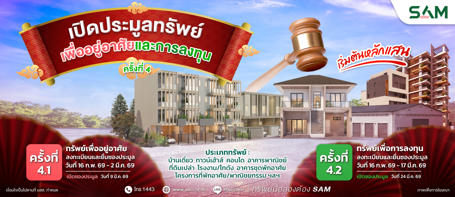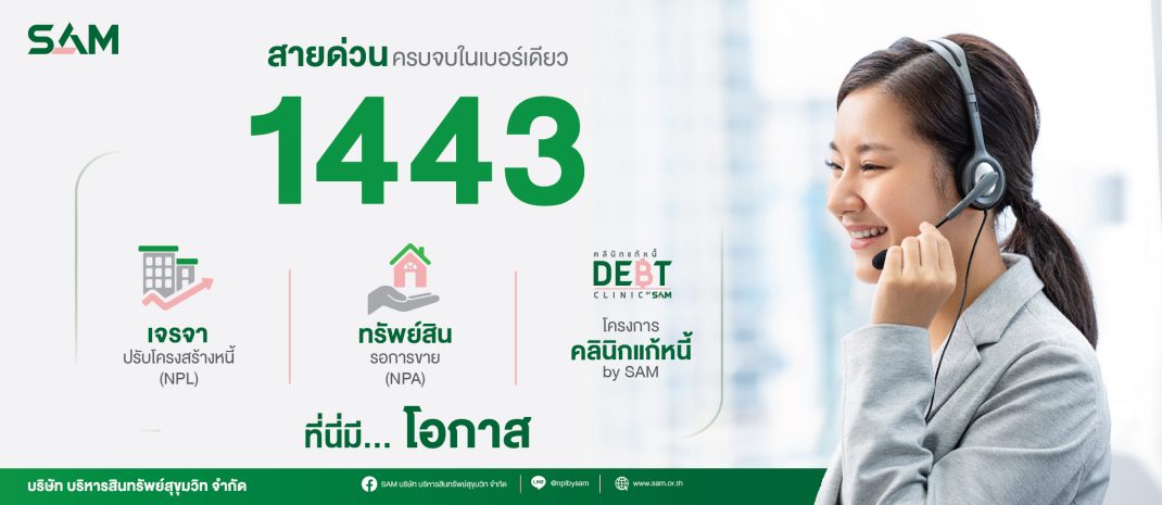 รายการทรัพย์ประมูล ครั้งที่ 4 / 69 รายการทรัพย์ประมูล ครั้งที่ 3 / 69 รายการทรัพย์ประมูล ครั้งที่ 2 / 69 แคมเปญ บ้าน SAM ผ่อนได้ เปิดศูนย์ธุรกิจภาคตะวันออก (ชลบุรี) SAM รวมสินเชื่อบ้านจากธนาคารชั้นนำ ITA ประจำปี 2567 1443 สายด่วน SAM SAM ทรัพย์มือสองต้องบอกต่อ