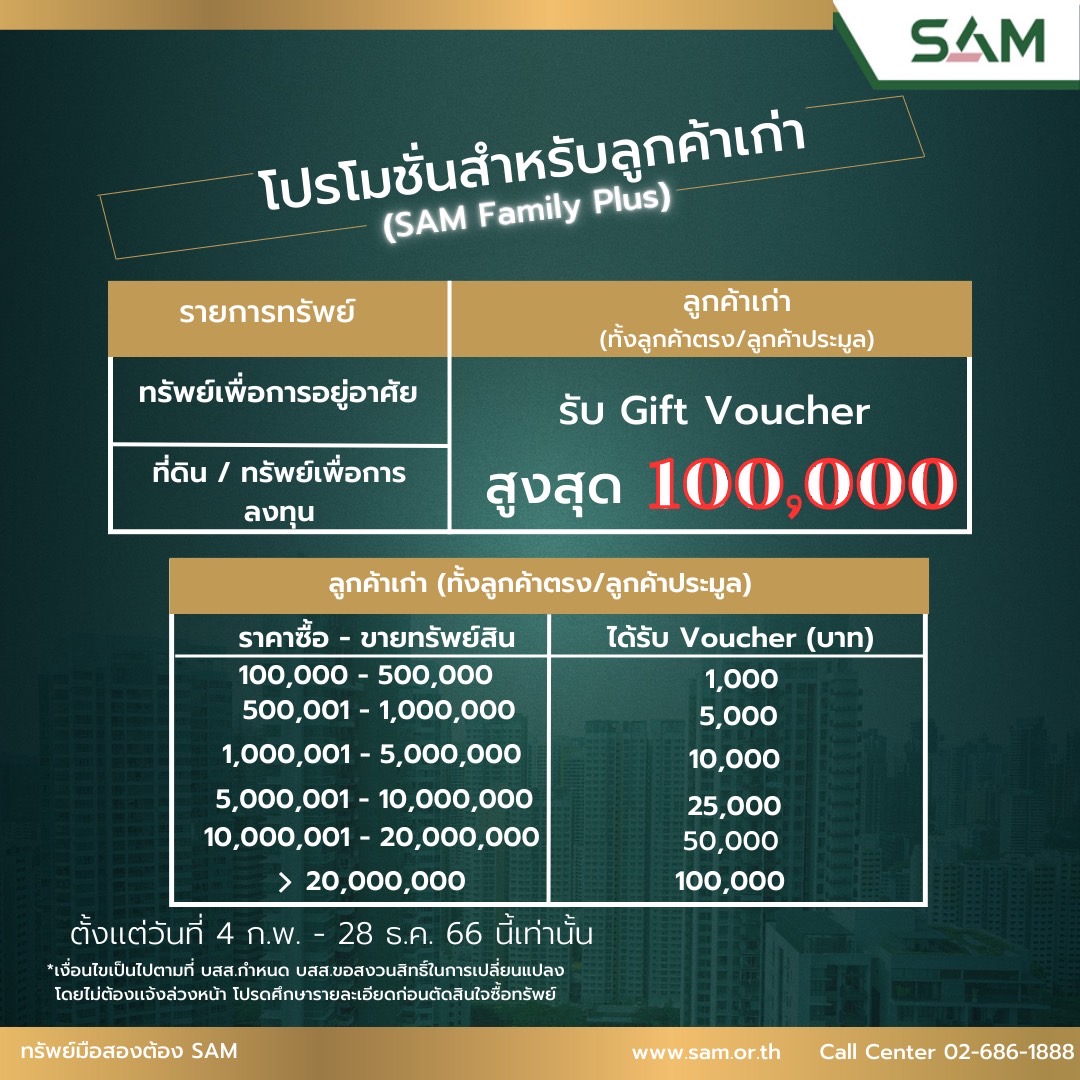 สำหรับลูกค้าเก่าที่ซื้อทรัพย์ทุกประเภท ไม่ว่าด้วยวิธีเสนอซื้อตรงหรือวิธีประมูล SAM มอบ Gift Voucher ให้คุณมูลค่าสูงสุด 100,000* บาท/ ทรัพย์ 1 รายการ โดยแบ่งราคา Gift Voucher ที่ลูกค้าจะได้รับ ดังนี้