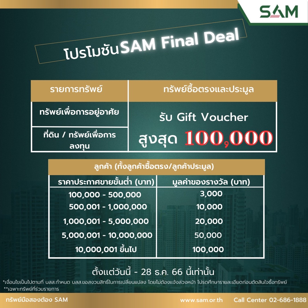 สำหรับลูกค้าที่ซื้อทรัพย์ทุกประเภท ไม่ว่าด้วยวิธีเสนอซื้อตรงหรือวิธีประมูล SAM มอบ Gift Voucher ให้คุณมูลค่าสูงสุด 100,000** บาท/ ทรัพย์ 1 รายการ โดยแบ่งราคา Gift Voucher ที่ลูกค้าจะได้รับ ดังนี้