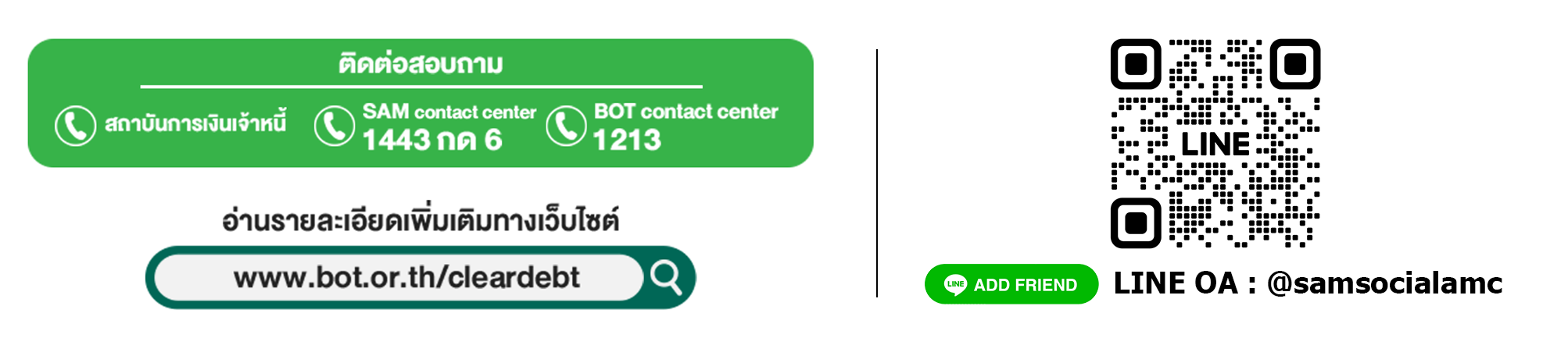 • ติดต่อ SAM (call center 1443 หรือ www.sam.or.th) สถาบันการเงินเจ้าหนี้เดิม หรือ BOT contact center 1213 ได้